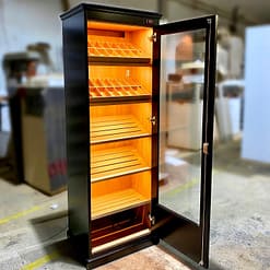 Con una capacidad de 100 cajas, este humidor clásico tiene el interior de cedro. Dispone de espacio inferior para el humidificador HR6, con doble trasera que reparte la humedad de forma uniforme. Higrostato exterior y luces LED de aviso para control preciso. Parte superior con cristal, ideal para la exposición de cajas y cigarros. Exterior disponible en diferentes acabados a elección.