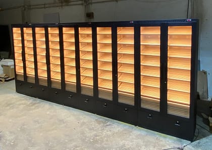 Los estancos, clubes y tiendas especializadas requieren soluciones específicas. Nuestros humidores vitrinas con puertas de cristal permiten exponer el producto con elegancia, mientras que el sistema HR6 mantiene los niveles de humedad óptimos incluso con una rotación constante de apertura. Además, diseñamos e instalamos cavas de gran formato para establecimientos que necesitan máxima capacidad y una presentación impecable.