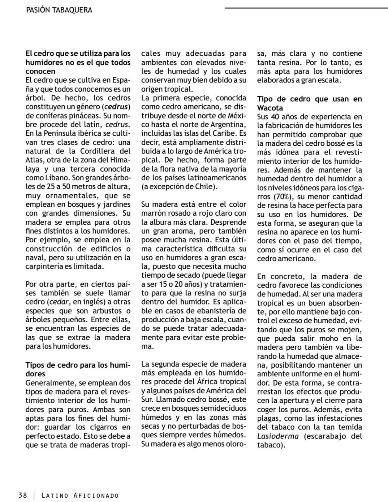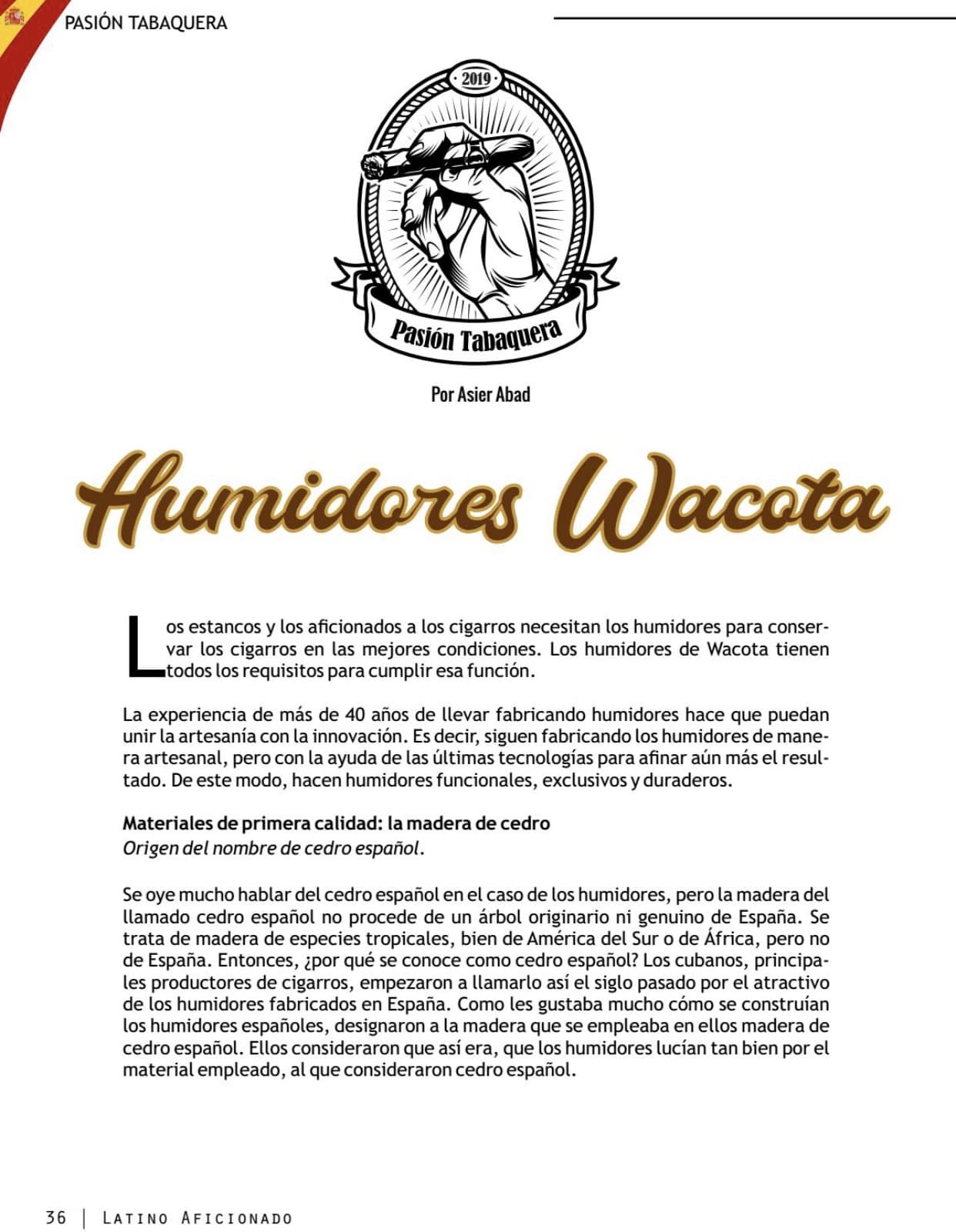 El reportaje de ‘Latino Aficionado’, que comienza en la página 36 de la revista’, arranca explicando por qué usamos madera de cedro en los humidores, el origen del nombre de cedro español y los tipos de madera de cedro que se emplean. Además, hace hincapié en la madera que empleamos en Humidores Wacota que, a lo largo de nuestros más de 40 años de experiencia, hemos comprobado que es la más idónea para los humidores.