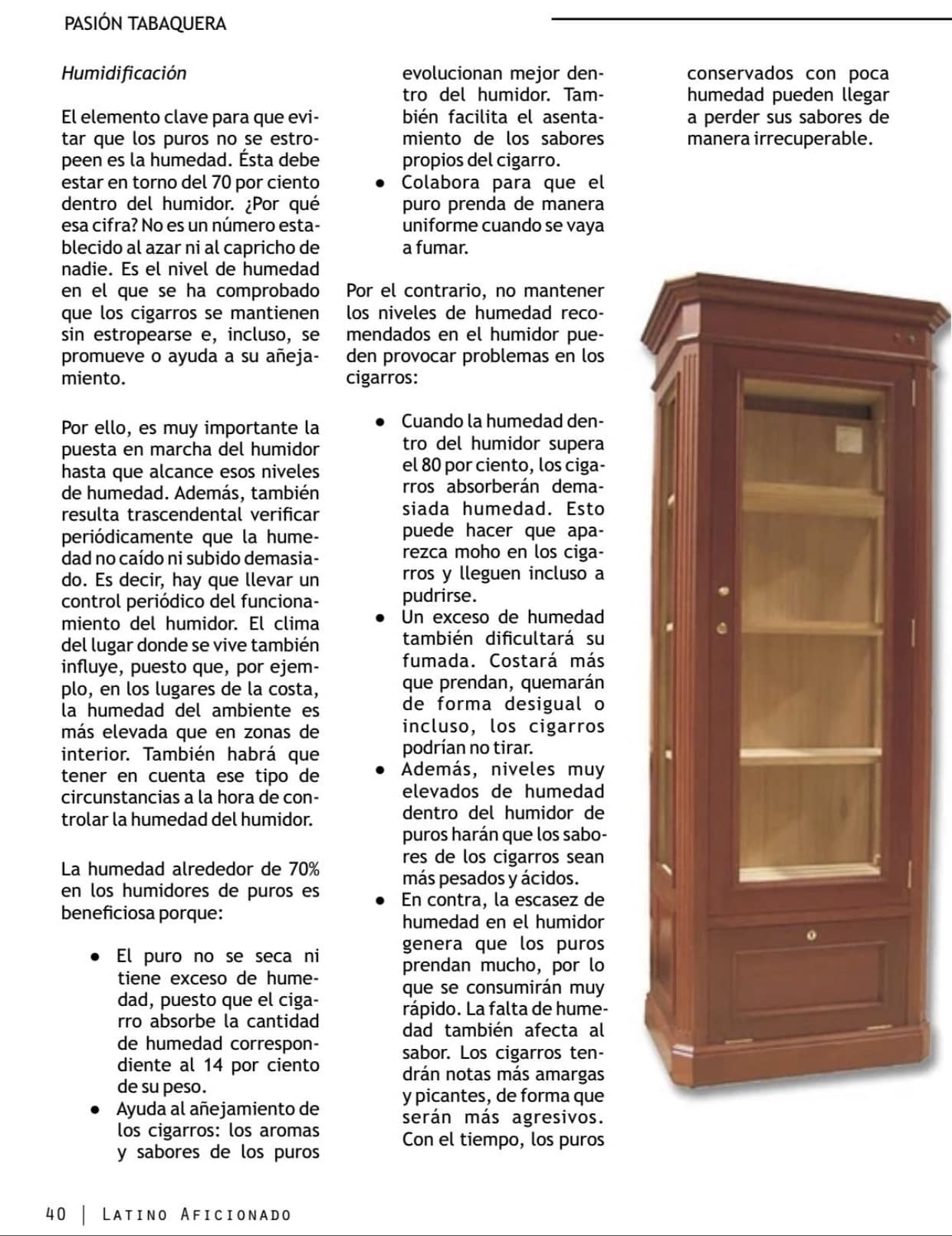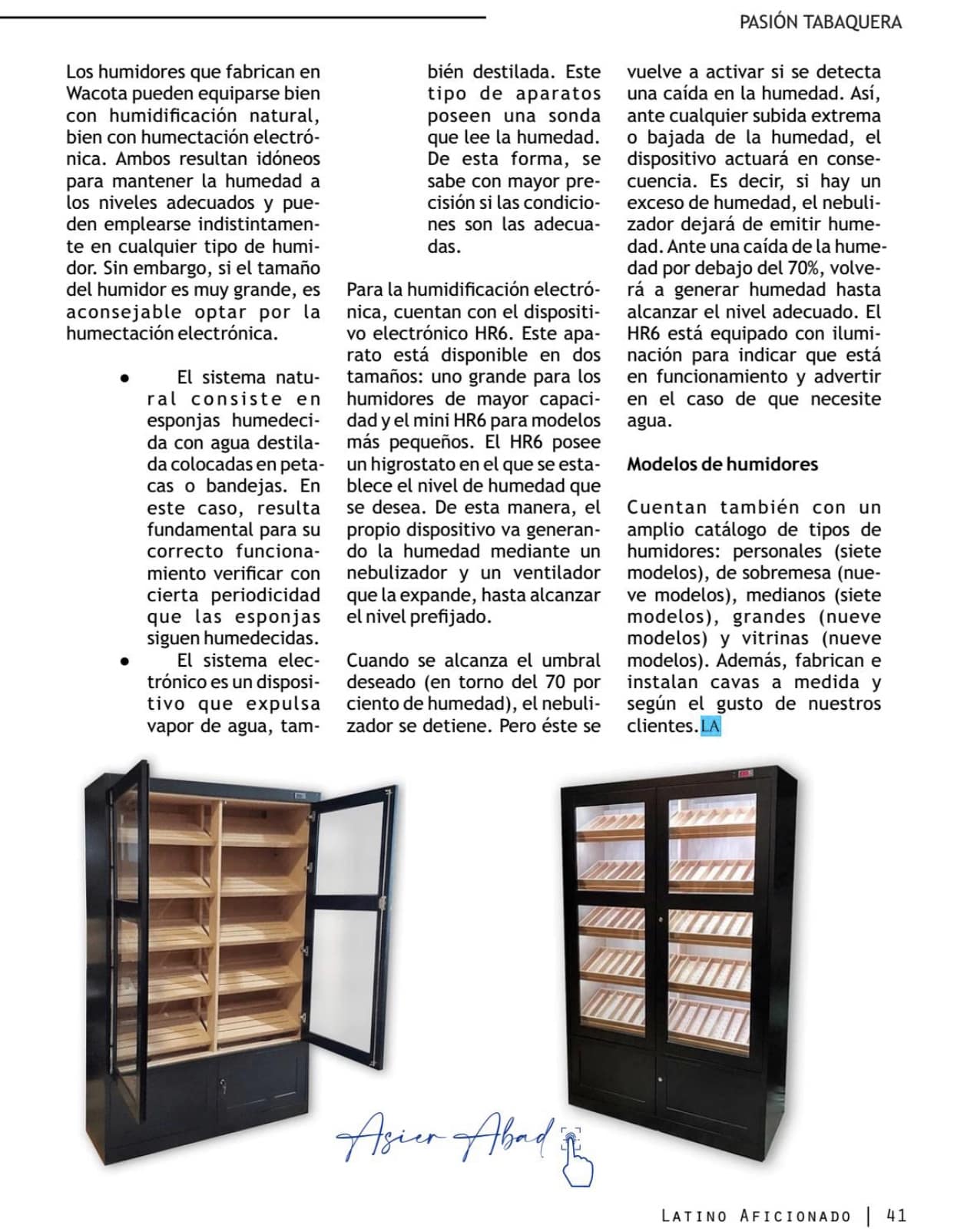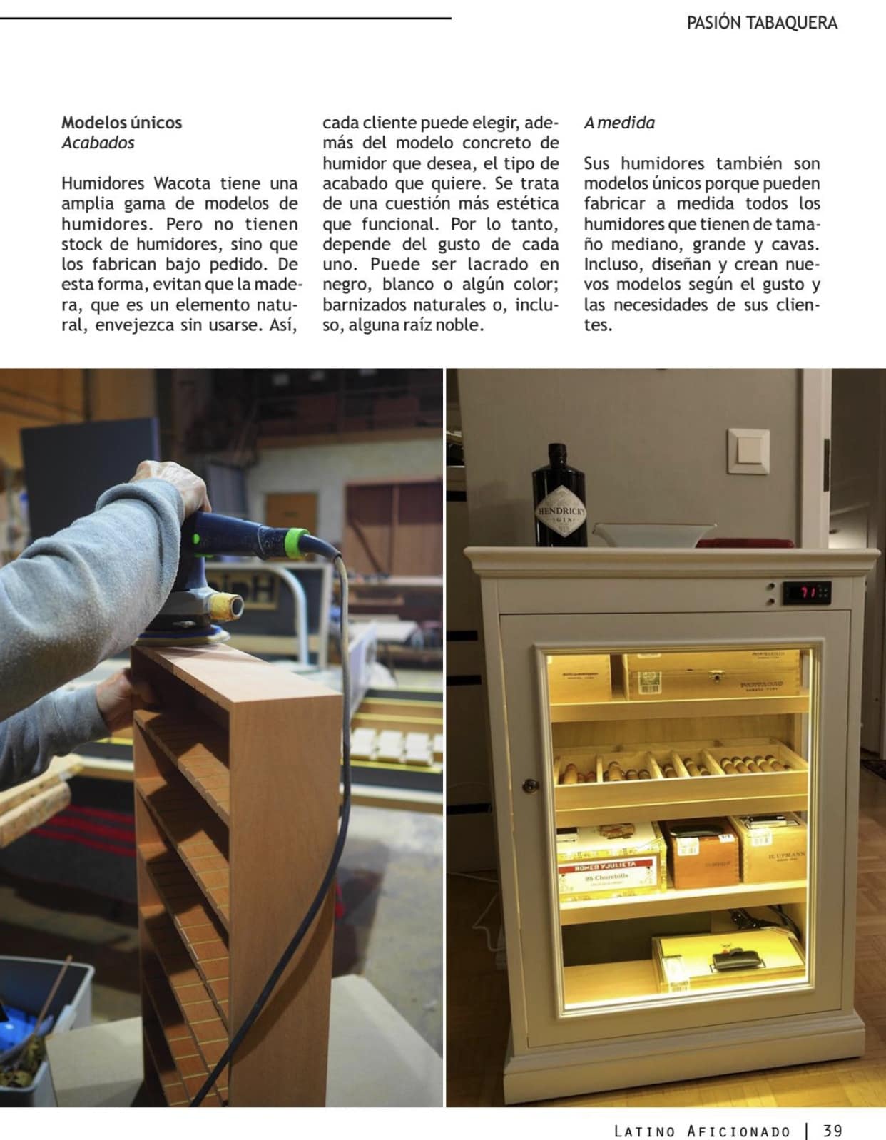 Por otro lado, el reportaje de ‘Latino Aficionado’ explica nuestro amplio catálogo de modelos, que se fabrican bajo pedido para evitar que la madera envejezca sin usarse. Los clientes pueden elegir el tipo de acabado y el sistema de humidificación –natural o electrónico–. También detalla que hacemos tu humidor a medida. Y subraya la importancia de los humidores en la conservación de puros, explicando la relevancia de la humedad.