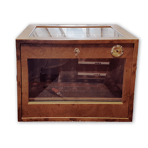 - Presidente: por su gran cantidad de cedro, este humidor de uso personal es una buena opción para el gran aficionado. Tiene una capacidad para albergar ocho cajas y hasta 100 cigarros surtidos. En este caso, la humectación puede ser mediante una bandeja con esponja en la parte inferior o electrónica. El higrómetro es analógico y se puede calibrar. El interior, realizado en cedro, tiene una balda para almacenar cajas. Pero, en este caso, existe un abanico de acabados exteriores entre los que elegir. Se puede optar por barnizado caoba, lacado negro, cerezo, nogal, bubinga y raíz de roble. El Presidente cristal es el mismo modelo que el Presidente con la diferencia de que tiene la parte superior de cristal, lo que permite ver el interior de la bandeja superior. También lleva cristal en la puerta frontal para ver el interior donde está el espacio para ubicar las cajas.